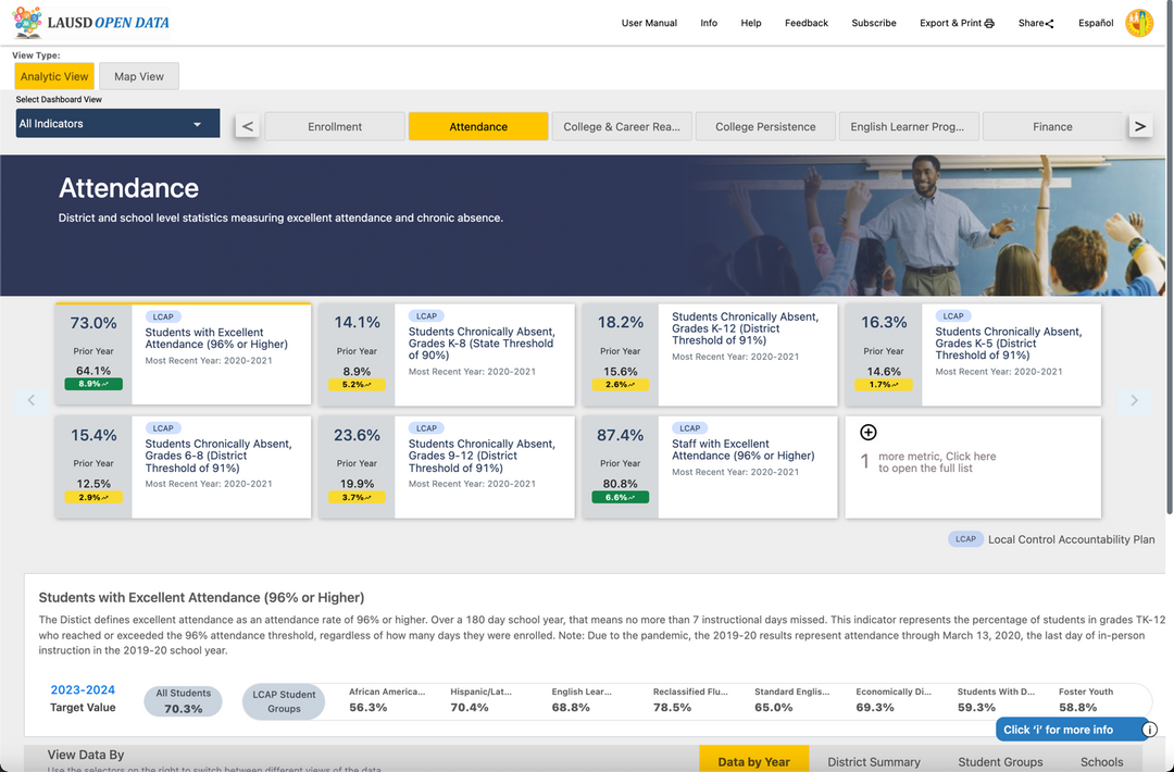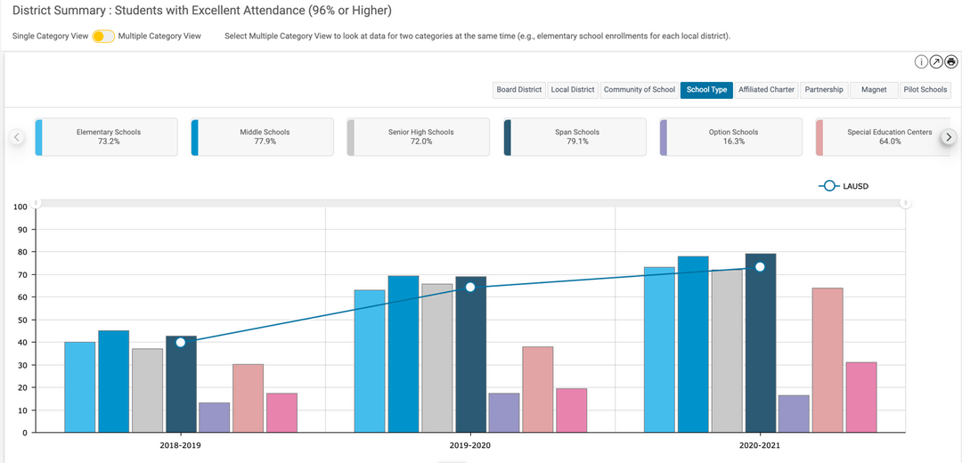 Explore school and district-wide trends using real-time integrated data at the school/campus or student subgroup level: